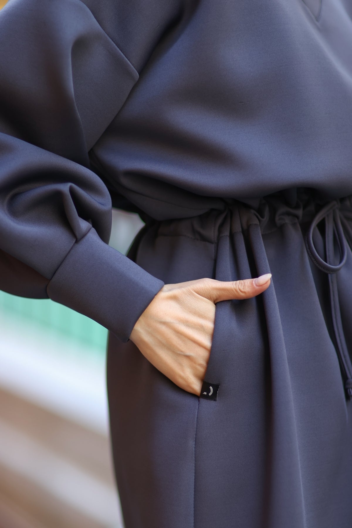 Long loose fitted dress with a drawstring at the waist. Neckline has a collar and dress includes two side pockets. Dress comes in standard size. Average length of the dress is 140 cm and suitable for sizes medium to large.