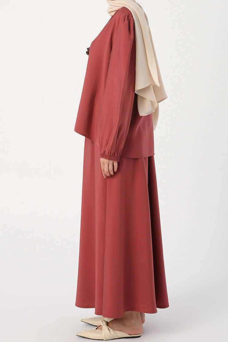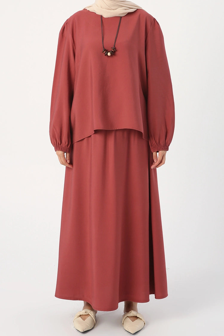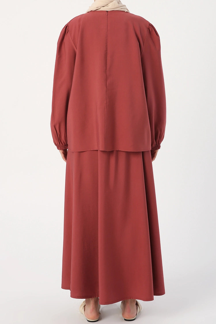This elegant brick red two piece tunic and skirt set provides timeless sophistication and luxury. Crafted from fabric of quality, this modest outfit is perfect for any occasion. Enjoy peace of mind with our 15 day return policy.